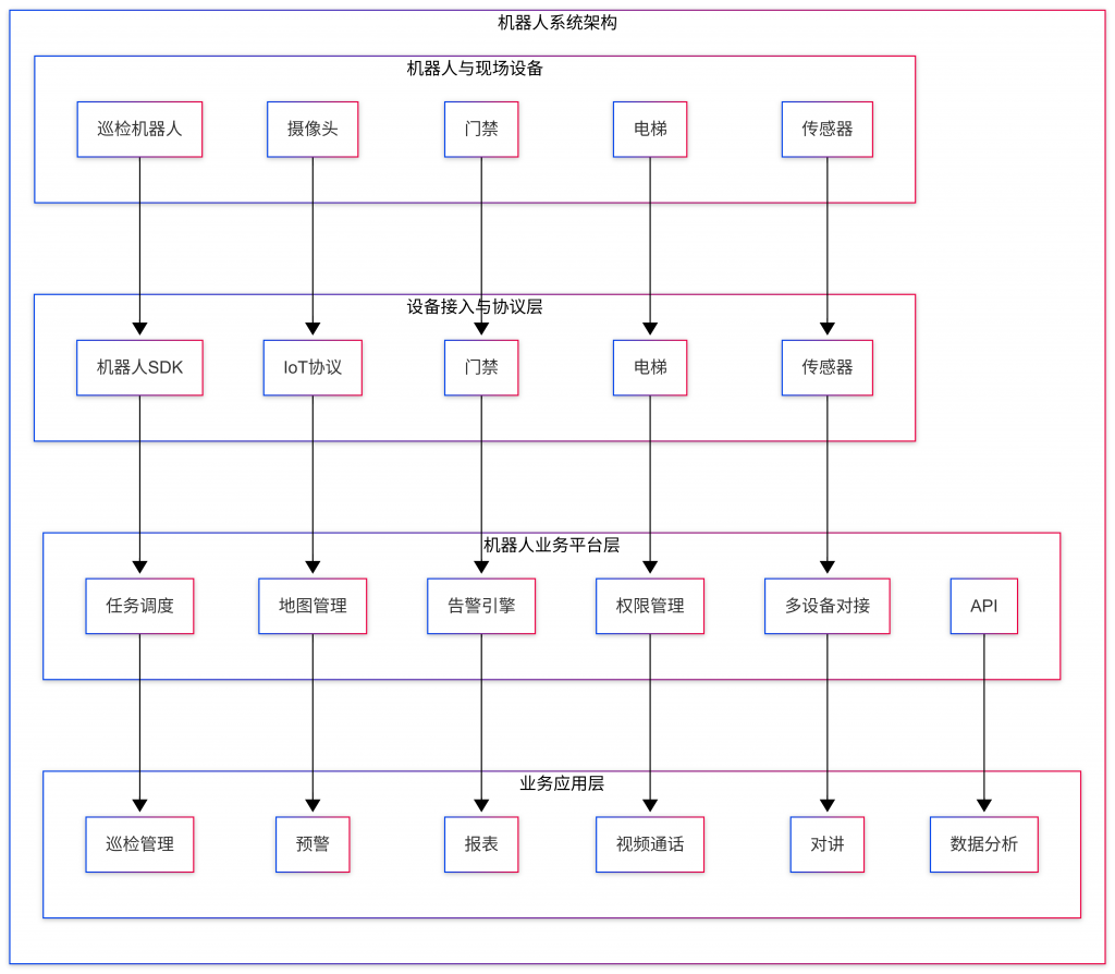 门禁、电梯、监控、传感器等系统各自独立,机器人无法与这些设备联动,导致巡检和运维无法形成闭环